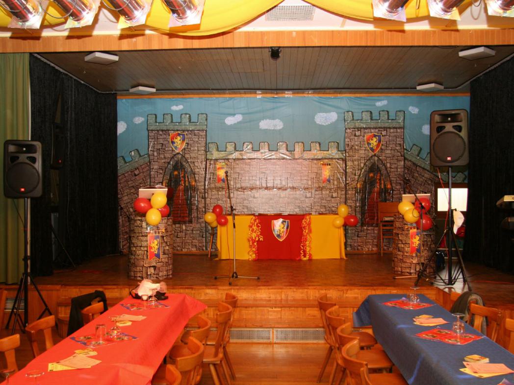 Vor Einzug des Fünferrates begrüßte der Hofnarr (Berthold Günther) die Ritter, Burgfräulein, Knappen usw. mit einem Prolog in gereimten mittelalterlichen Versen. Der Fünferrat (Andrea Stork, Heike Kahlert, Mathias Lies, Volker Stork und dem Oberhaupt des Ganzen, Ritter Fred zu Schlackenstein Manfred Mößle) zog unter den Klängen eines Fanfarenmarsches in die farbenfreudig und fantasievoll dekorierte Sängerhalle ein.
