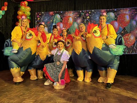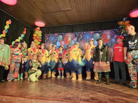 Andrea Höhne und Gabi Mößle schlüpften in die Rollen von Margot und Lisbeth und sorgten für weitere Lacher. Ellen Dörr begeisterte mit einem Vortrag über ein in die Jahre gekommenes Tanzmariechen. Die Funzelchen, ein Ensemble aus Heike Kahlert, Bine Grass, Andrea Höhne, Nicole Lies, Andrea Stork, Gabi Mößle und Gabi Ross, zeigten einen witzigen Schautanz als „aufgeblasene Hühner“, der das Publikum in Staunen versetzte.